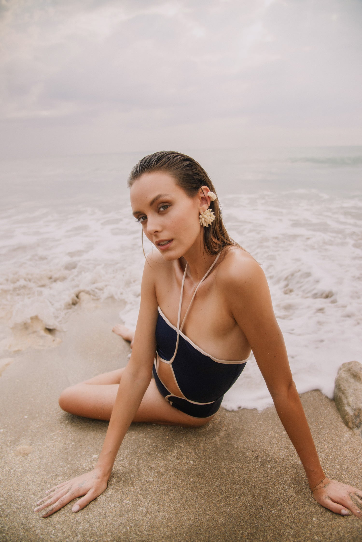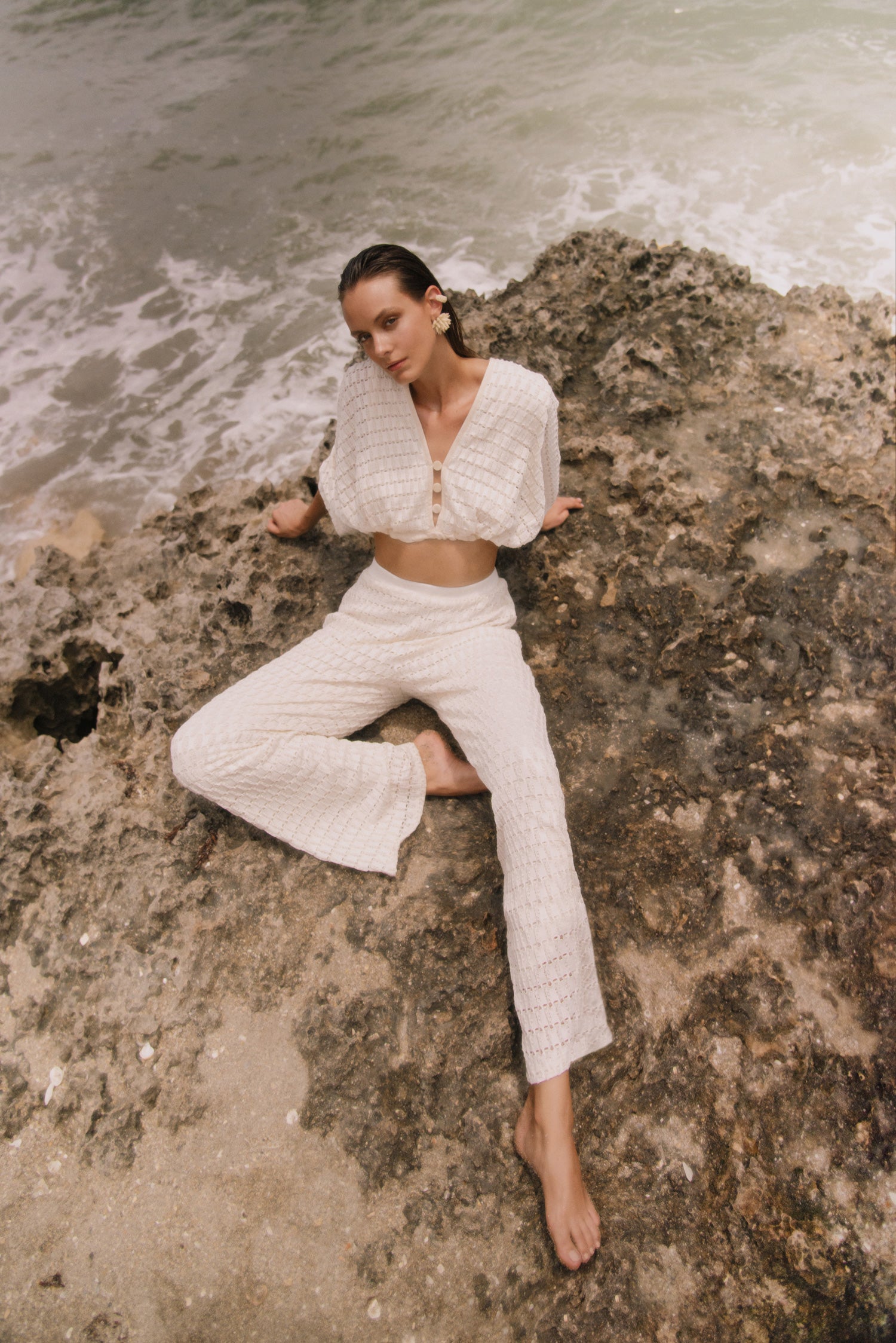Aunque Nami es una continuación de la estética única de la marca, con nuevas versiones de los estilos festoneados de la insignia, también presenta un par de nuevas técnicas, como los baños de color hechos a mano, así como el uso de taguas, una semilla especial que crece dentro de las palmeras amazónicas y, debido a su color y fuerza, a menudo se denomina marfil vegetal. También estamos lanzando algunas siluetas nuevas que juegan con los aspectos esculturales de la ola.