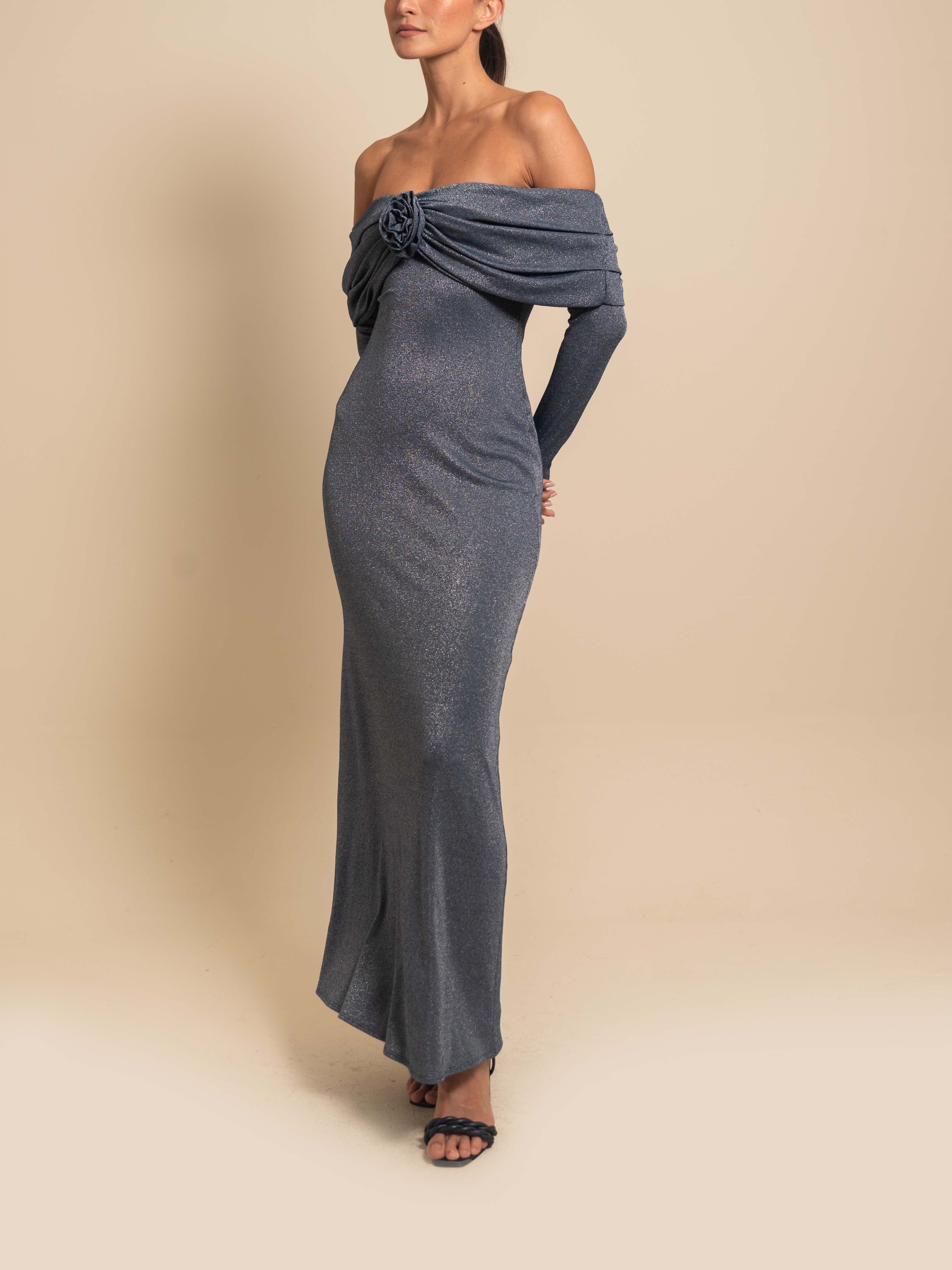 Daisy Dress reinventa el eveningwear con un escote off-shoulder fluido y mangas largas que se funden con la silueta. Confeccionado en un knit suave con brillo sutil, su diseño se centra en una rosa escultórica que añade volumen y dramatismo al torso, mientras que la caída alargada estiliza el cuerpo con ligereza. Elegante y contemporáneo, se mueve con naturalidad y atrapa la luz en cada paso, logrando un efecto hipnótico imposible de ignorar. Una pieza pensada para noches inolvidables, donde la sofisticación se expresa sin esfuerzo.