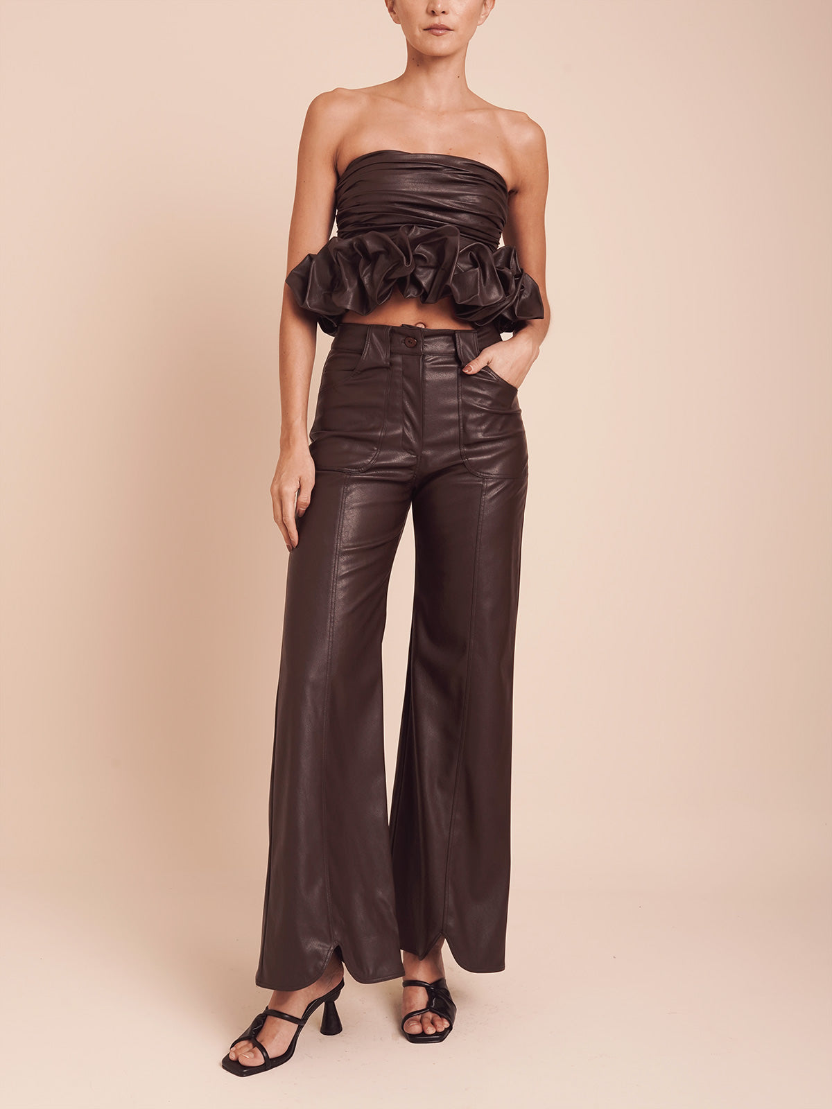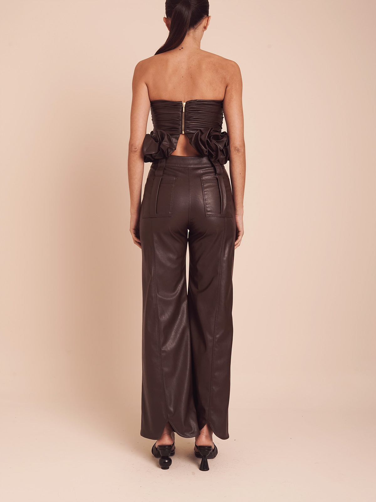 Jerry Top es una pieza statement confeccionada en cuero vegano color espresso. Su bustier drapeado con escultura y el maxi volante en el ruedo crean un equilibrio entre volumen, textura y sofisticación contemporánea. Con cierre posterior que asegura un fit impecable, este top transforma cualquier look, desde noches de cóctel hasta un estilo moderno de día a noche. Combínalo con pantalones a juego o de tiro alto para un set inolvidable.