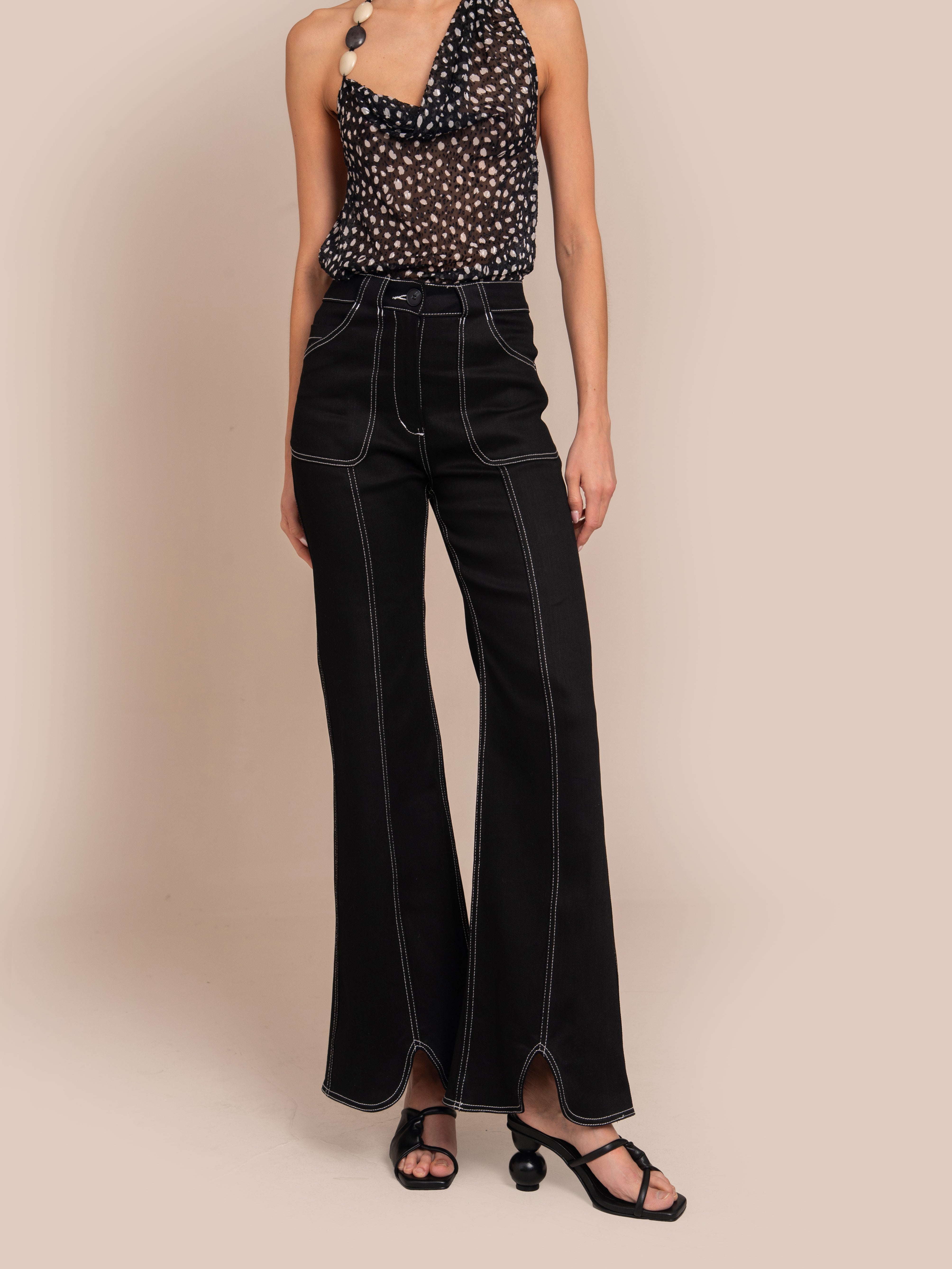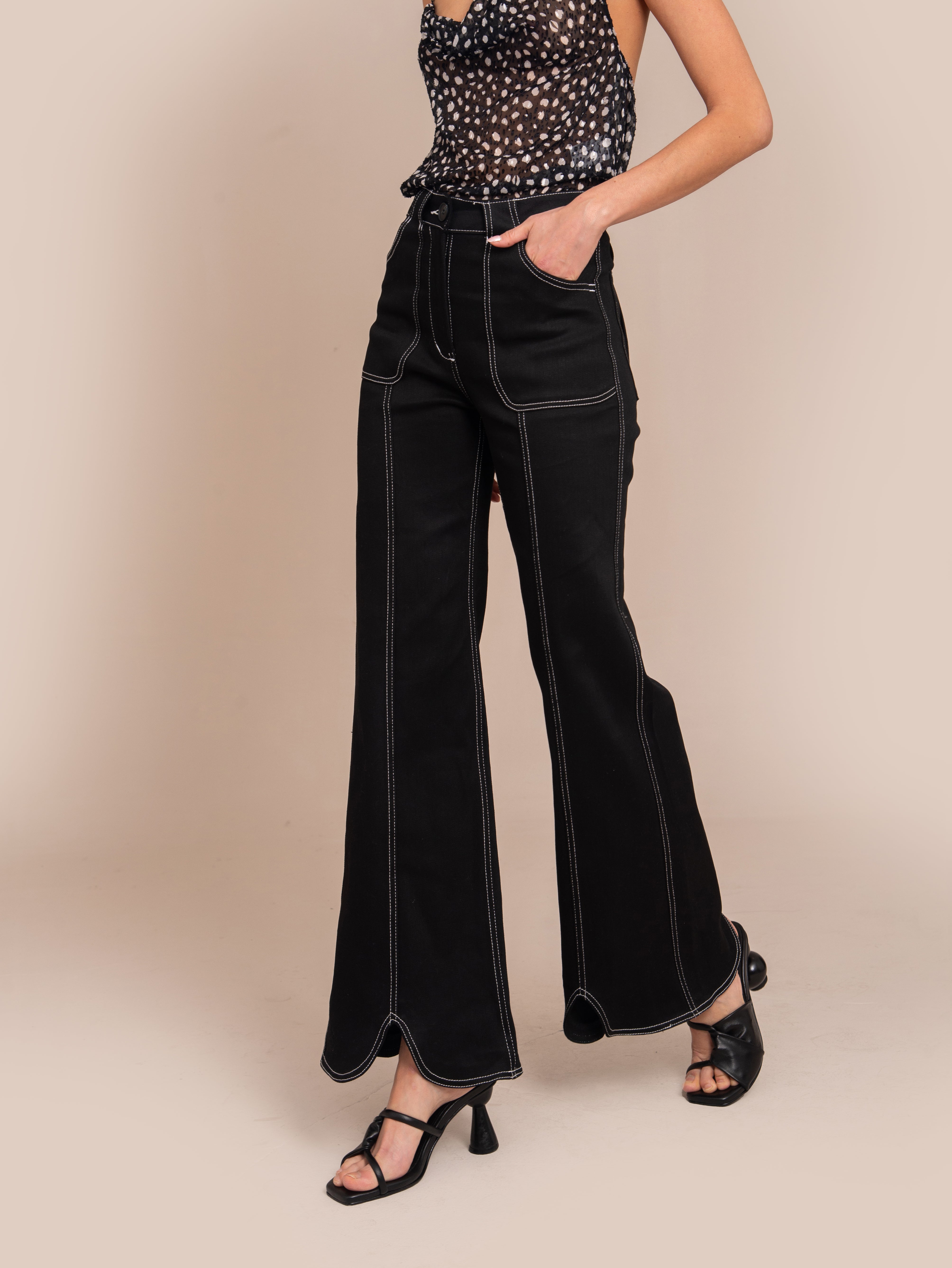 Josefa Jean Black es una versión contemporánea del denim, confeccionado en mezclilla premium con costuras en contraste que realzan sus líneas arquitectónicas. Su diseño de tiro alto y pierna amplia estiliza todas las siluetas, creando un efecto alargado y pulido. El ruedo en forma de scallop añade un toque distintivo y artístico, propio de AZULU, mientras que la comodidad y versatilidad del tejido lo convierten en una pieza esencial para el guardarropa moderno. Perfecto para elevar looks cotidianos o acompañar tops statement.