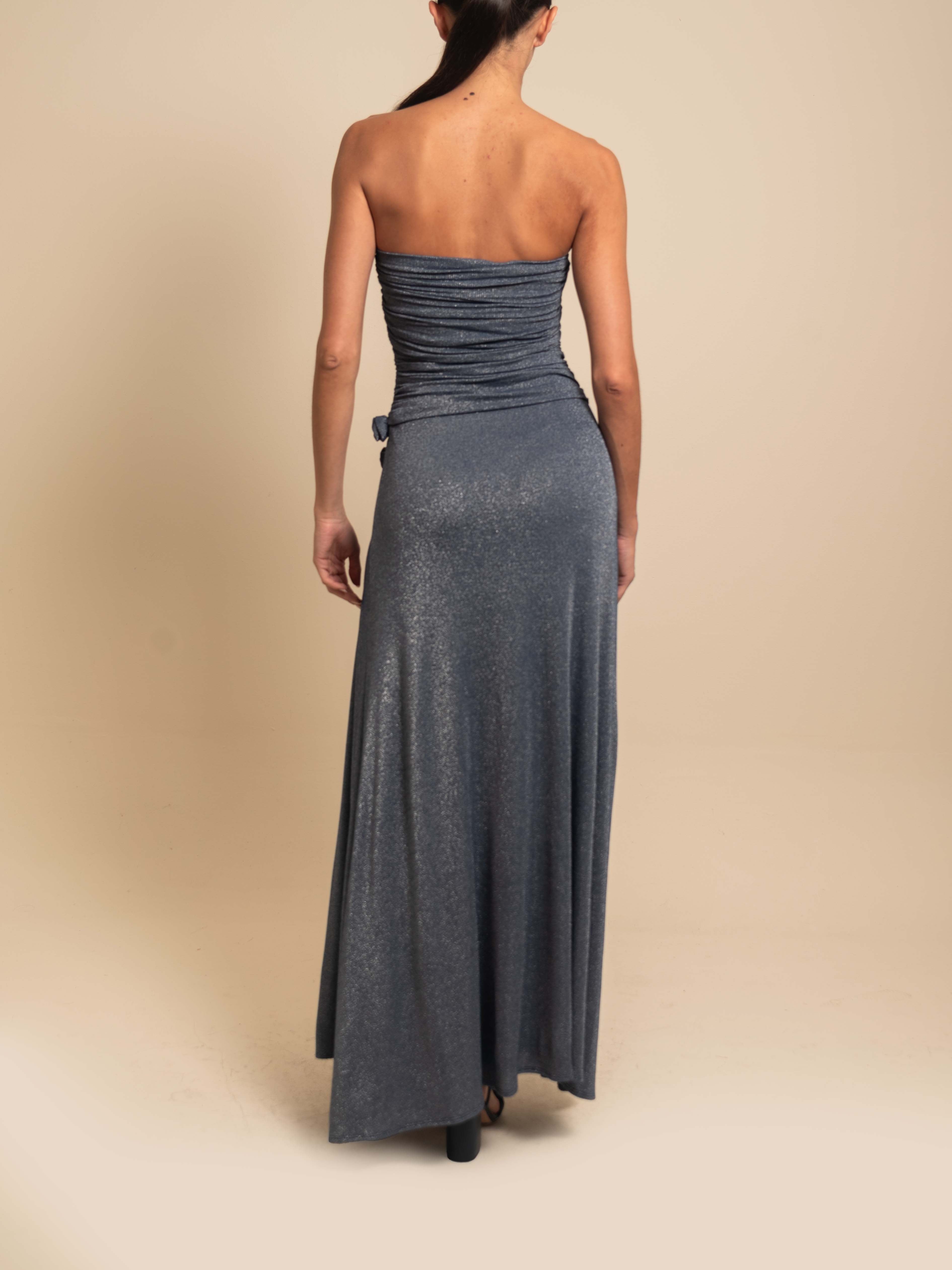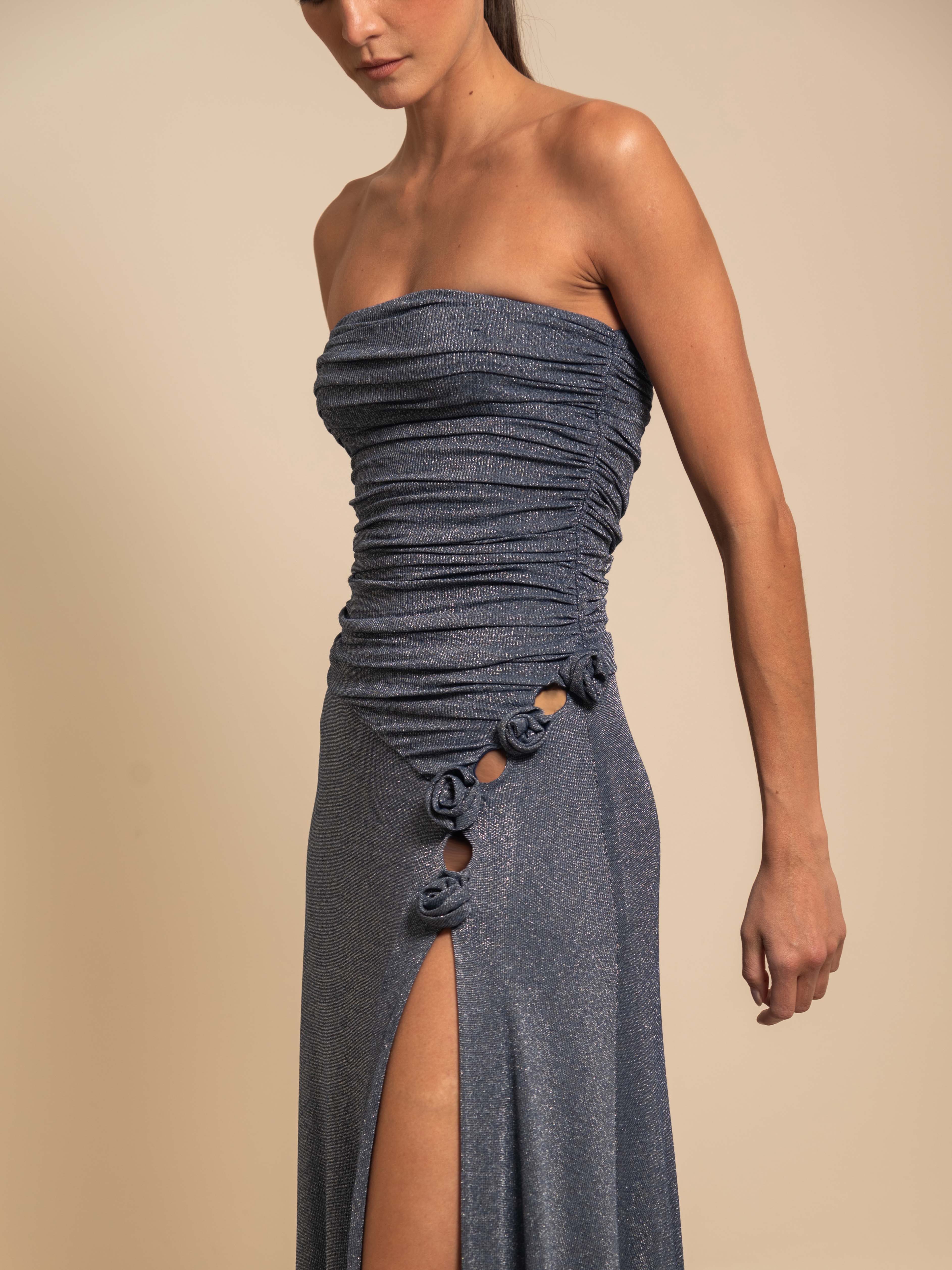 kaeli Gown es un statement en movimiento y magnetismo. Confeccionado en un tejido de punto metálico que se ajusta y esculpe, presenta un bustier fruncido que ciñe la cintura y una abertura lateral que revela lo justo. Delicadas rosas recorren la abertura como una constelación inesperada, femenina y escultórica. Su acabado brillante atrapa la luz en cada paso, evocando un aire vintage y a la vez futurista. Una silueta strapless que redefine el evening dress con poder silencioso, creado para la mujer que atrae todas las miradas sin decir una palabra.