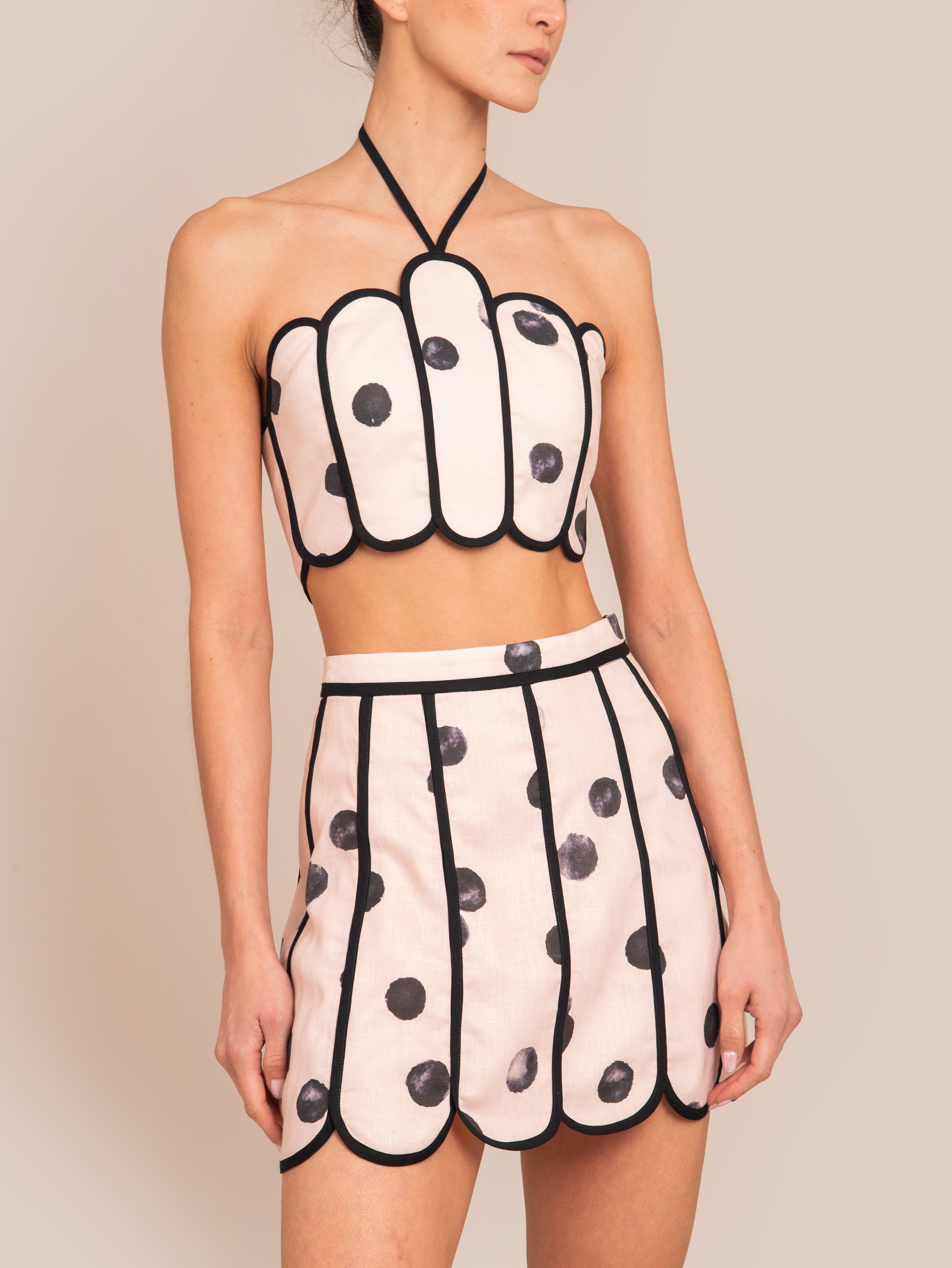 Lenny Top presenta un escote halter con paneles festoneados que crean una silueta estructurada pero alegre. Se anuda elegantemente alrededor del cuello e incluye una cremallera trasera para un ajuste sin costuras. Diseñado para los días cálidos, este top ofrece un look único y fresco sin esfuerzo. Combínalo sin esfuerzo con la falda Sunrise para un conjunto llamativo o póntelo con pantalones monocromáticos para un look urbano.