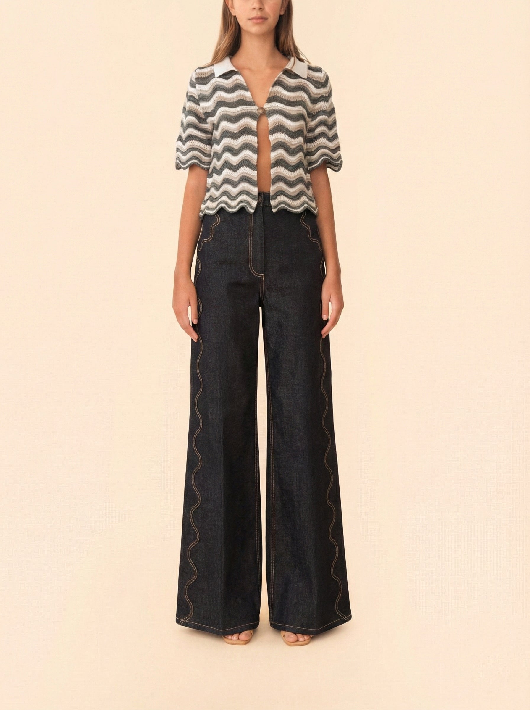 l Malai Jean, elaborado en 99% algodón con un toque de elasticidad, presenta una cintura alta y una silueta amplia que estiliza la figura.